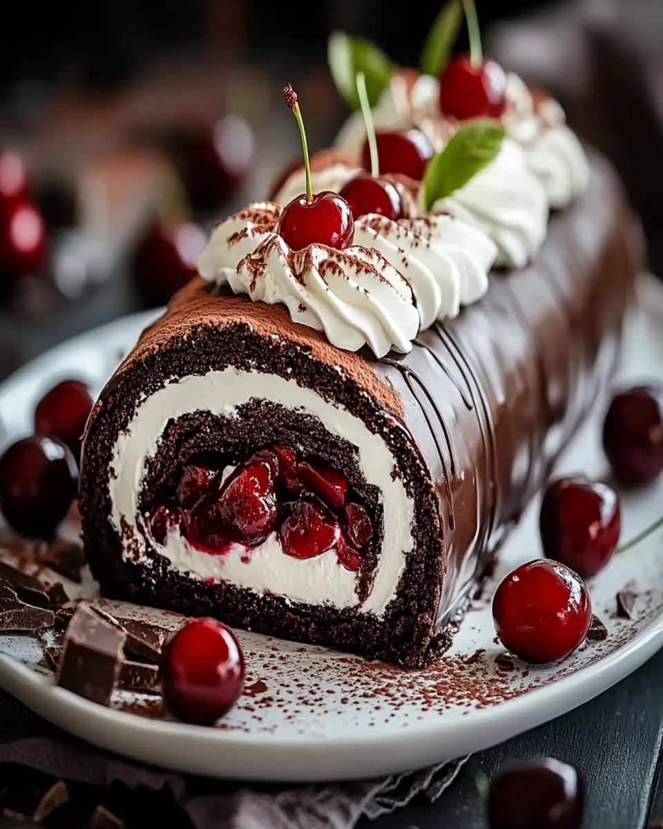 To complement the rich chocolate and tart cherries, consider serving the Swiss roll with a cup of freshly brewed coffee or a glass of dessert wine. A light sparkling wine can also provide a refreshing contrast that enhances the flavors of the dish.
