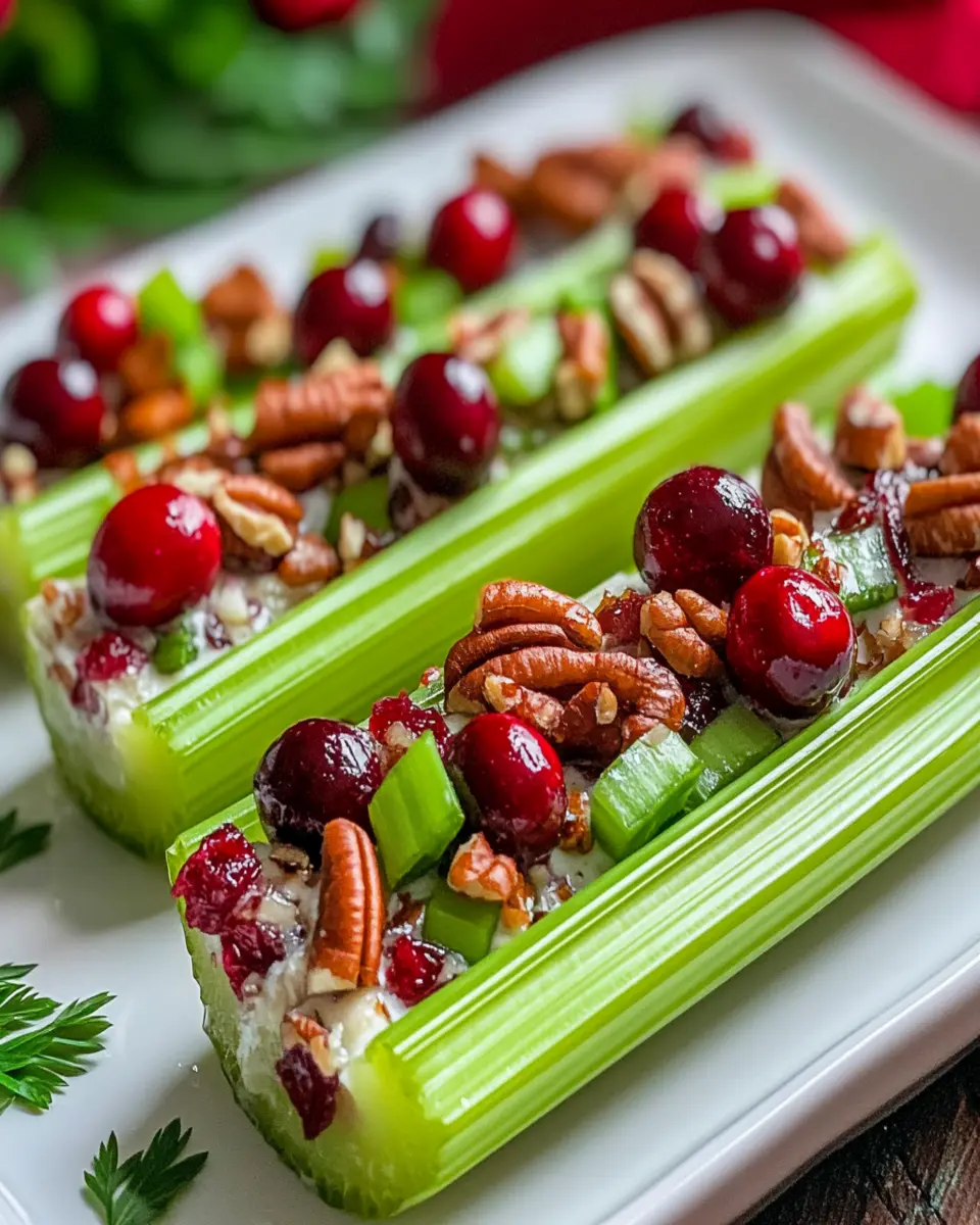 A festive and crunchy appetizer featuring fresh celery, creamy cheese, and a sweet and nutty cranberry pecan filling.