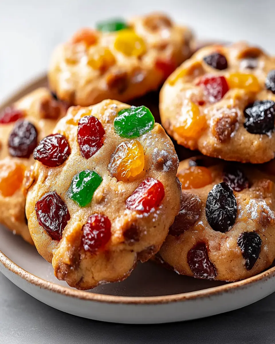 Delicious fruitcake cookies that combine the sweet flavors of dried fruits and nuts.