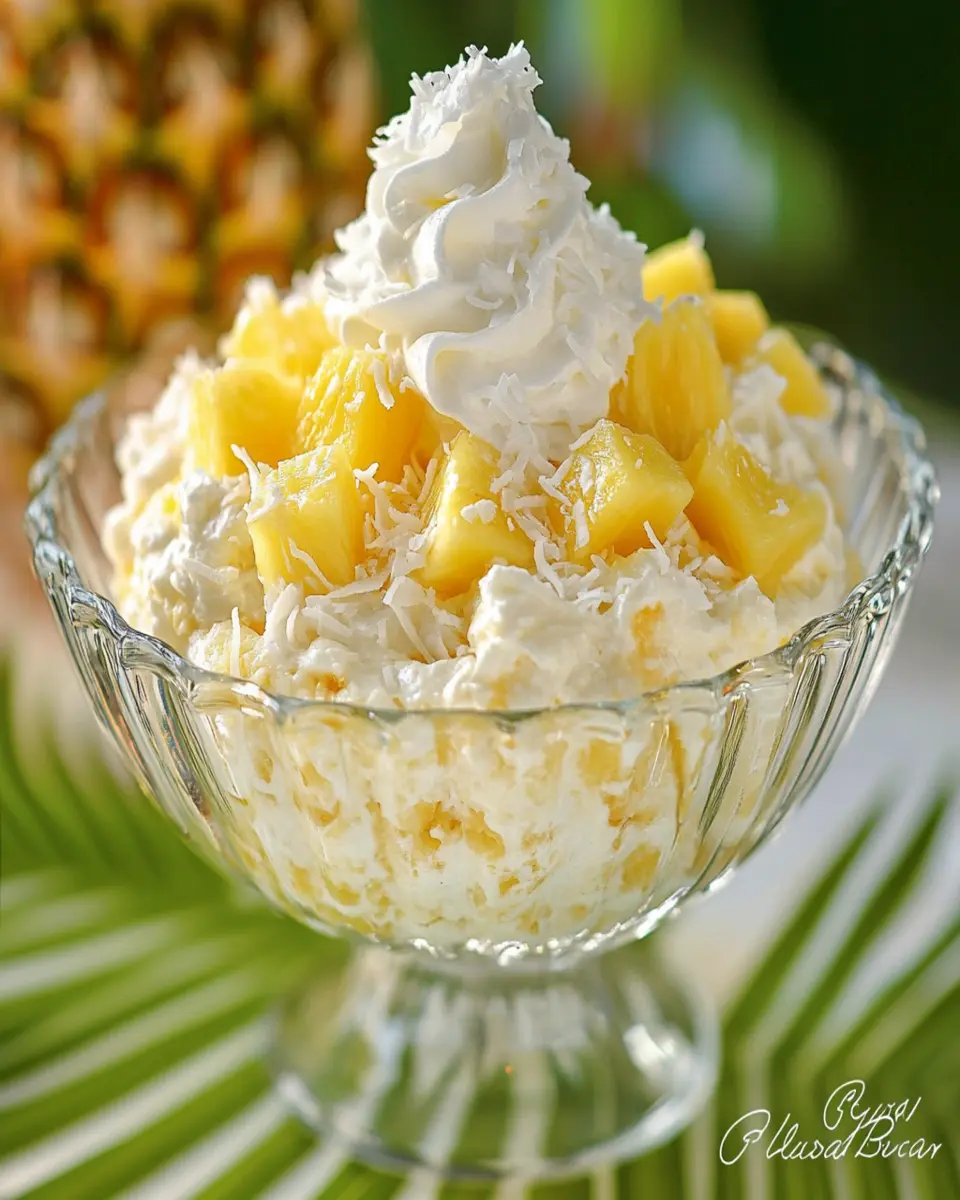 A tropical dessert that combines the flavors of pineapple and coconut in a fluffy, creamy mixture.
