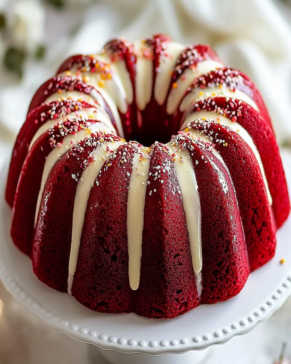 A rich and decadent Red Velvet Bundt Cake topped with cream cheese frosting.