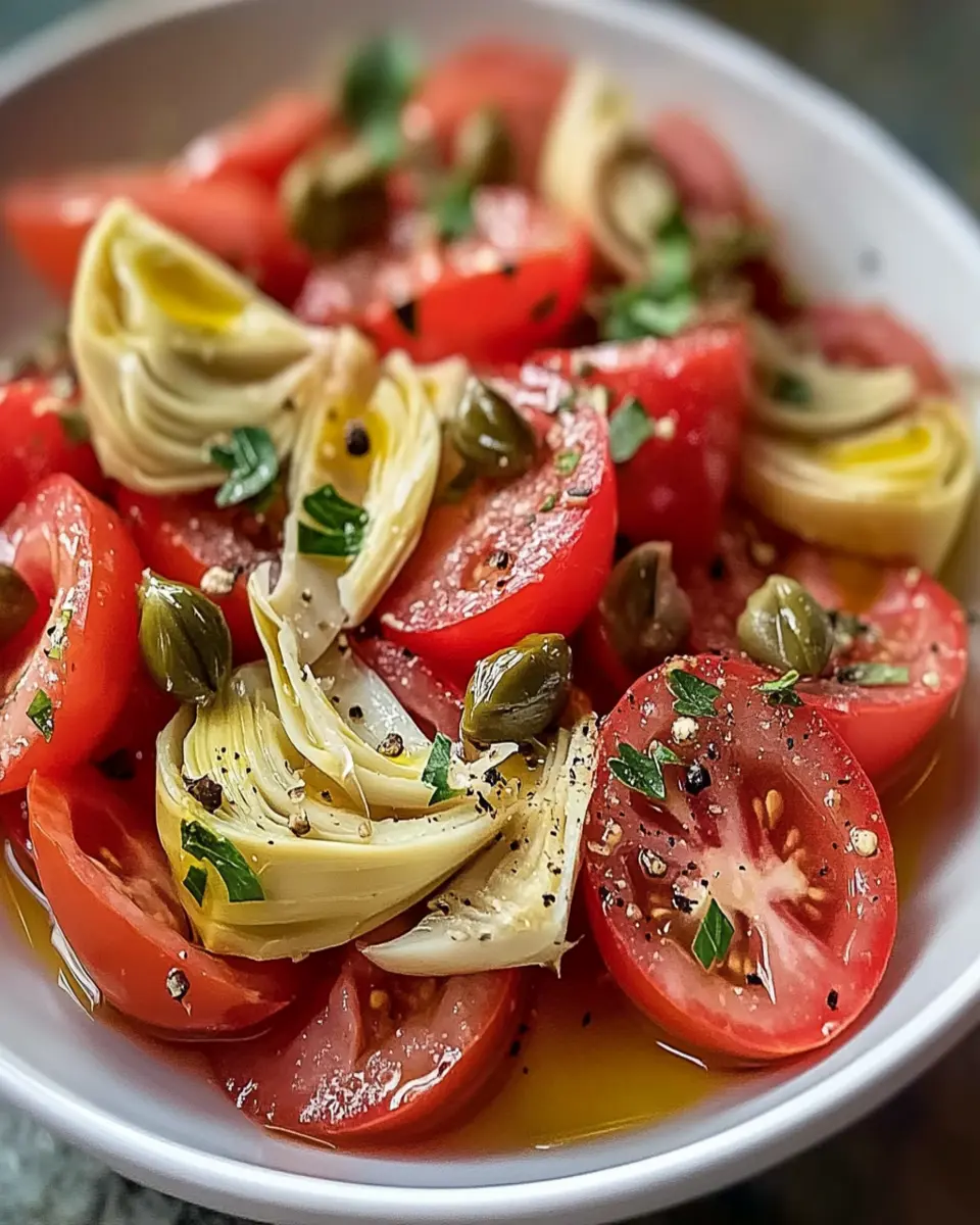 This Refreshing Tomato and Artichoke Salad with Capers is a delightful and zesty dish perfect for warm weather meals or as a side dish.