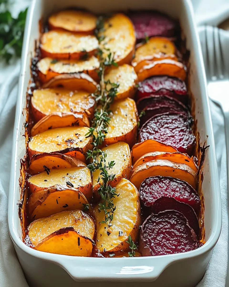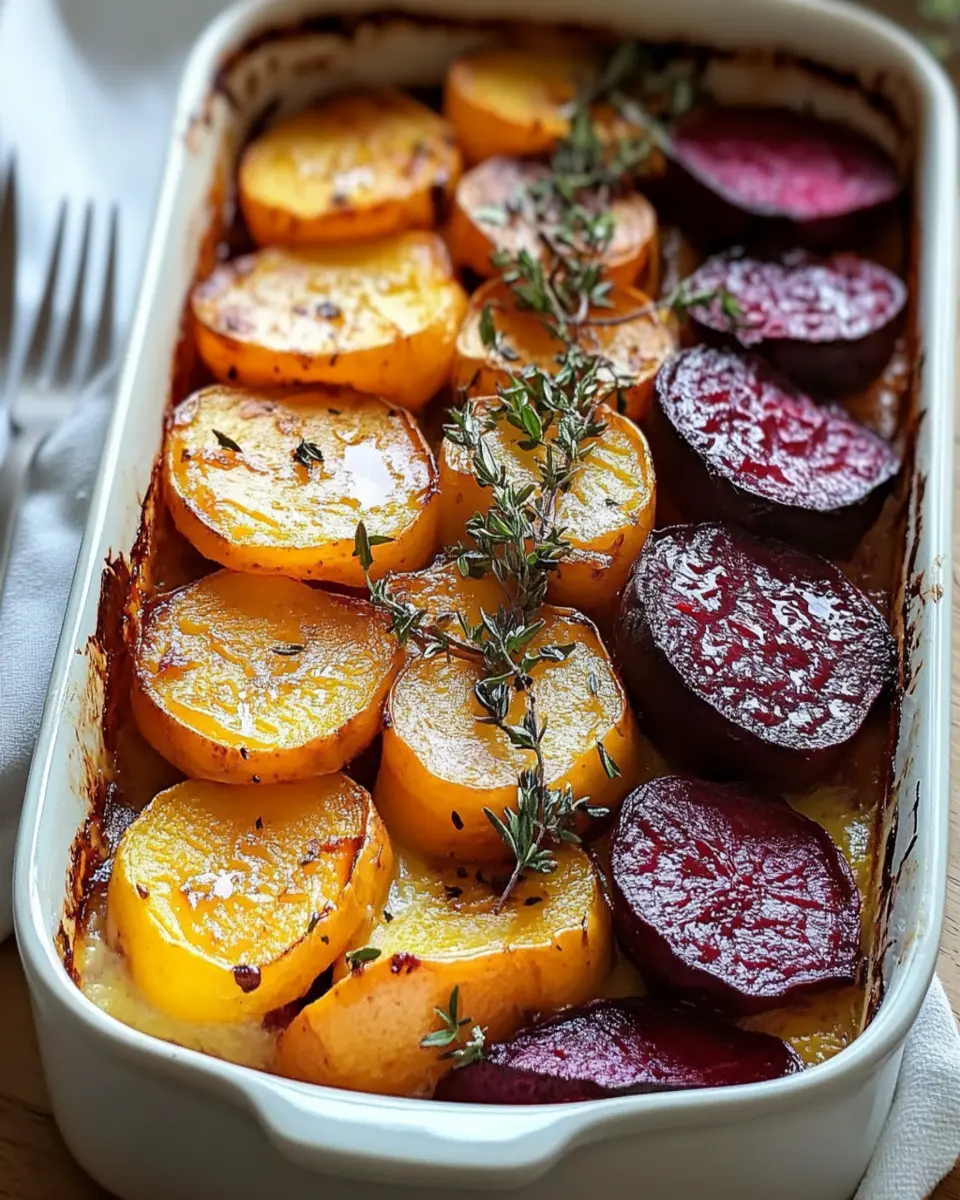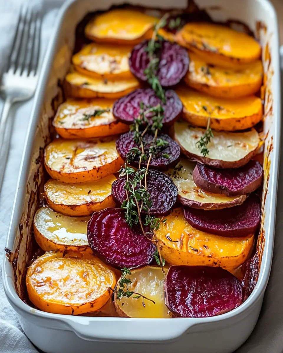 A delicious and hearty gratin made with layers of sweet potatoes, parsnips, and beets, baked to perfection.